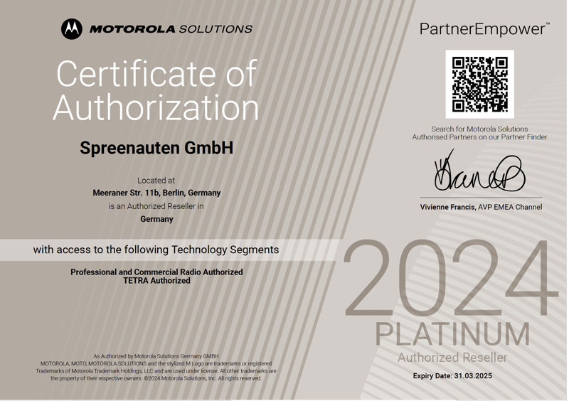 WeiterlesenWe are proud to announce that Spreenauten GmbH has once again been recognized as a Motorola Platinum Partner in 2025 for both DMR (Digital Mobile Radio) and TETRA (Terrestrial Trunked Radio). This prestigious partner status represents the highest level of trust, technical excellence, and strategic collaboration with...