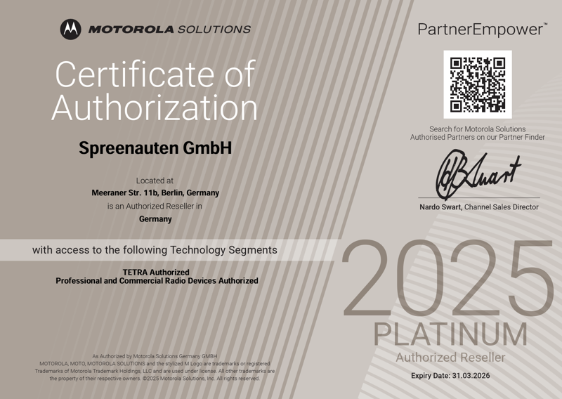 Spreenauten GmbH has been one of the largest and leading Motorola partners in Europe for many years - licensed for DMR, TETRA incl. Dimetra Express. Together with our local partners and our extremely effective network, we provide services worldwide on site.